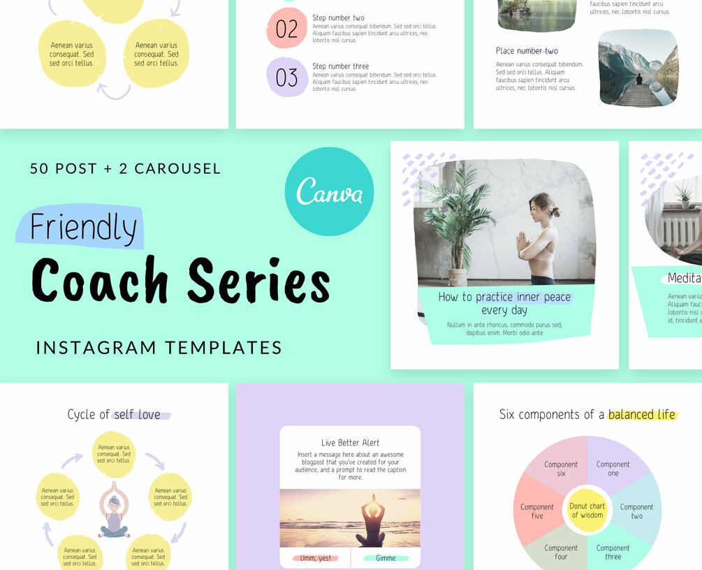 50 Instagram Post Templates + 2 Carousel - Friendly Coach Pack (All elements included)