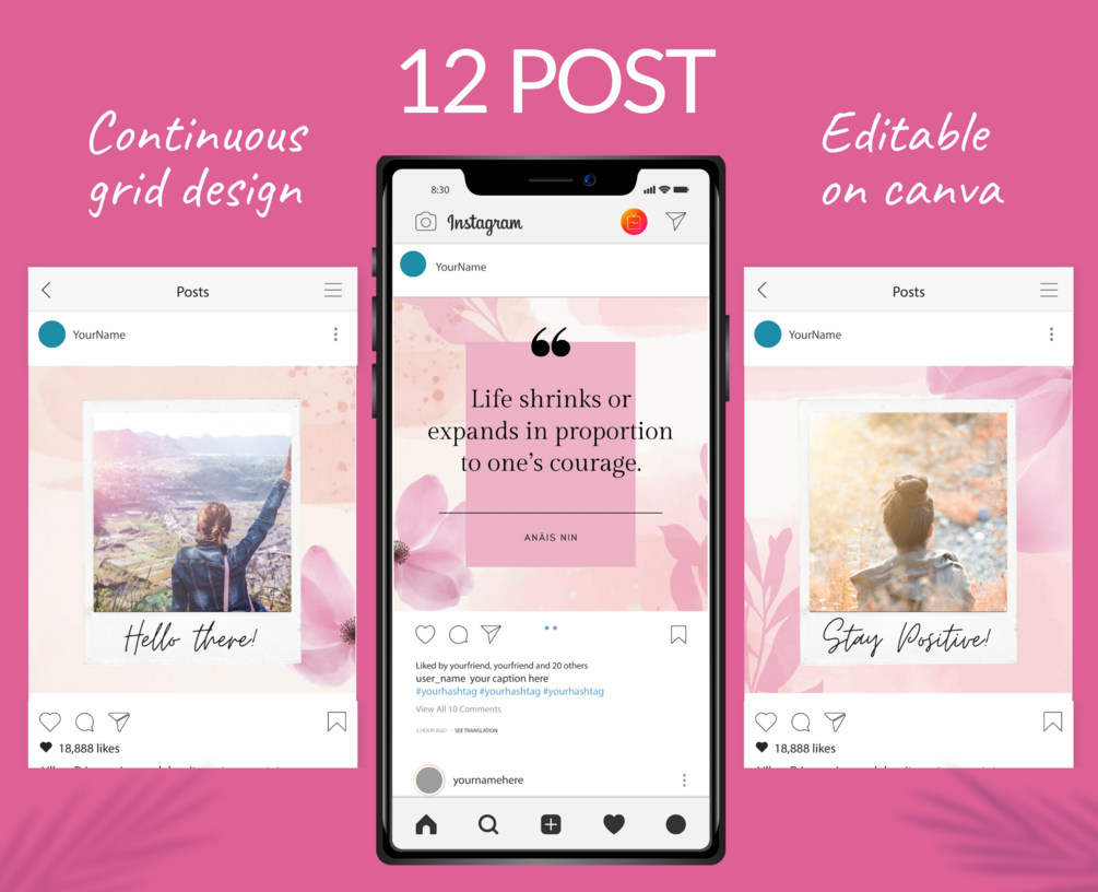 Pink Flowers Instagram Puzzle Template for Canva (All elements included). Create beautiful photo collages and quotes in a cohesive seamless grid.